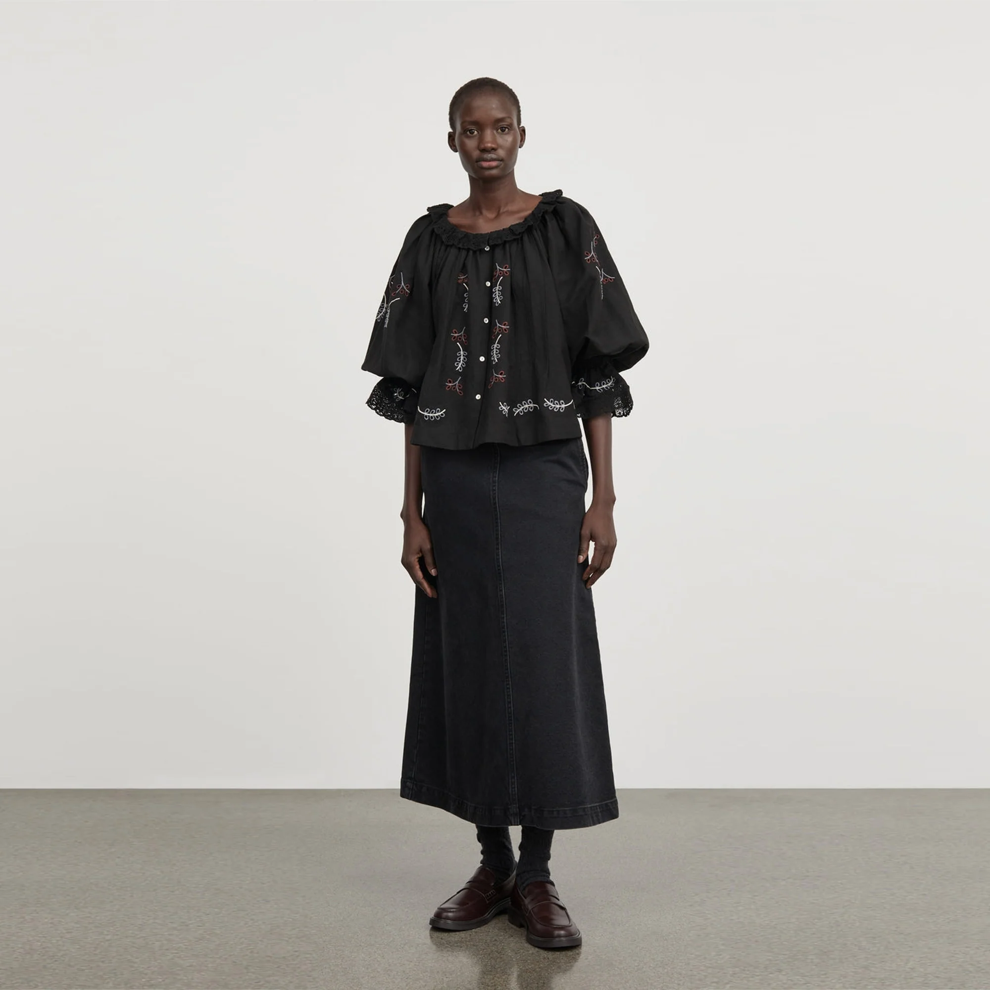 TheĀ SkallĀ story started in the coastal area of Northern Jutland where Julie and Marieās great-grandfather and his brothers collected seashells and sold them for chicken feed to earn a living. This is also how the family got its last nameĀ Skall, meaning seashell in Danish. Today the seashells are still a source of inspiration. The seashells remind them that nature, animals and humans are closely connected ā and of their ancestorsā simple way of living. That less is enough. Values that the sisters wish to pass on to everyone buying aĀ SkallĀ piece. Update your wardrobe staples with this option from Skall Studio. Ā This Aliso blouse is crafted in an organic cotton and a linen mix for a casual everydayĀ look. This black Aliso blouse features a round neck lace collar and buttoned down the front, the embroidery detail is fabulous and the sleeves are voluminous with a n elastic cuff. This detailed blouse will add to a cool elevated look your AW wardrobe.